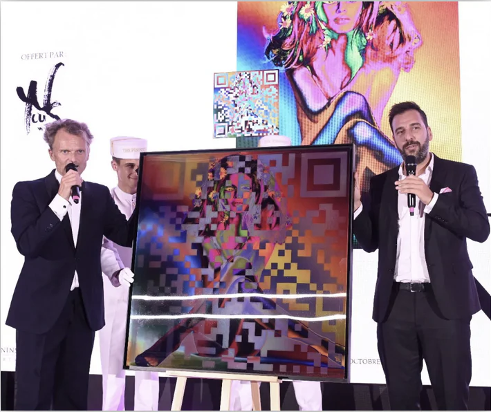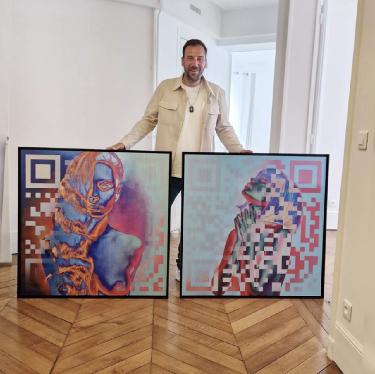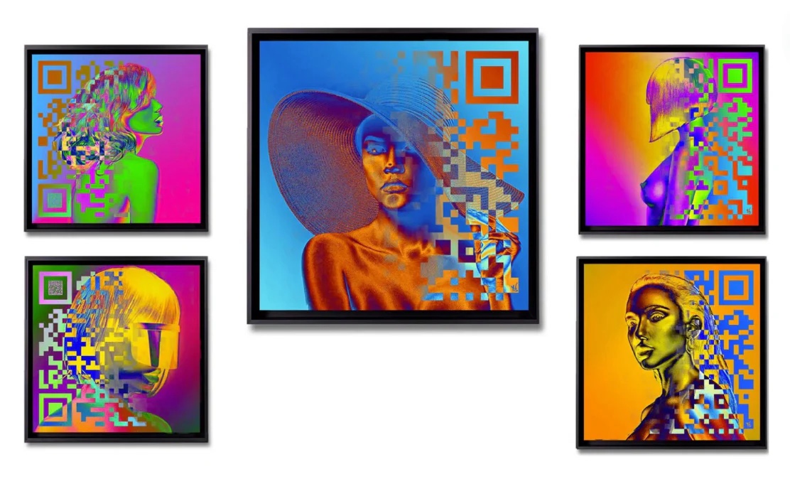 This self-taught artist, who has experience as an optician and carpenter, has contemplated the emergence of a new world dominated by AI: “Today, QR codes are ubiquitous— found on menus, event tickets, invitations… Their prevalence prompted me to make them more glamorous through my art. Thus, the QR code comfortably integrates into his collection “Chromatic Faces.”